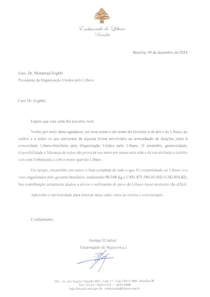 O Encarregado de Negócios da Embaixada do Líbano no Brasil, George El Jallad, enviou uma carta oficial ao Dr. Mohamed El Zoghbi, Presidente da Unidos Pelo Líbano (UPL), para expressar sua gratidão pelo empenho e solidariedade da organização e da comunidade libano-brasileira na arrecadação de doações destinadas ao auxílio do povo libanês.