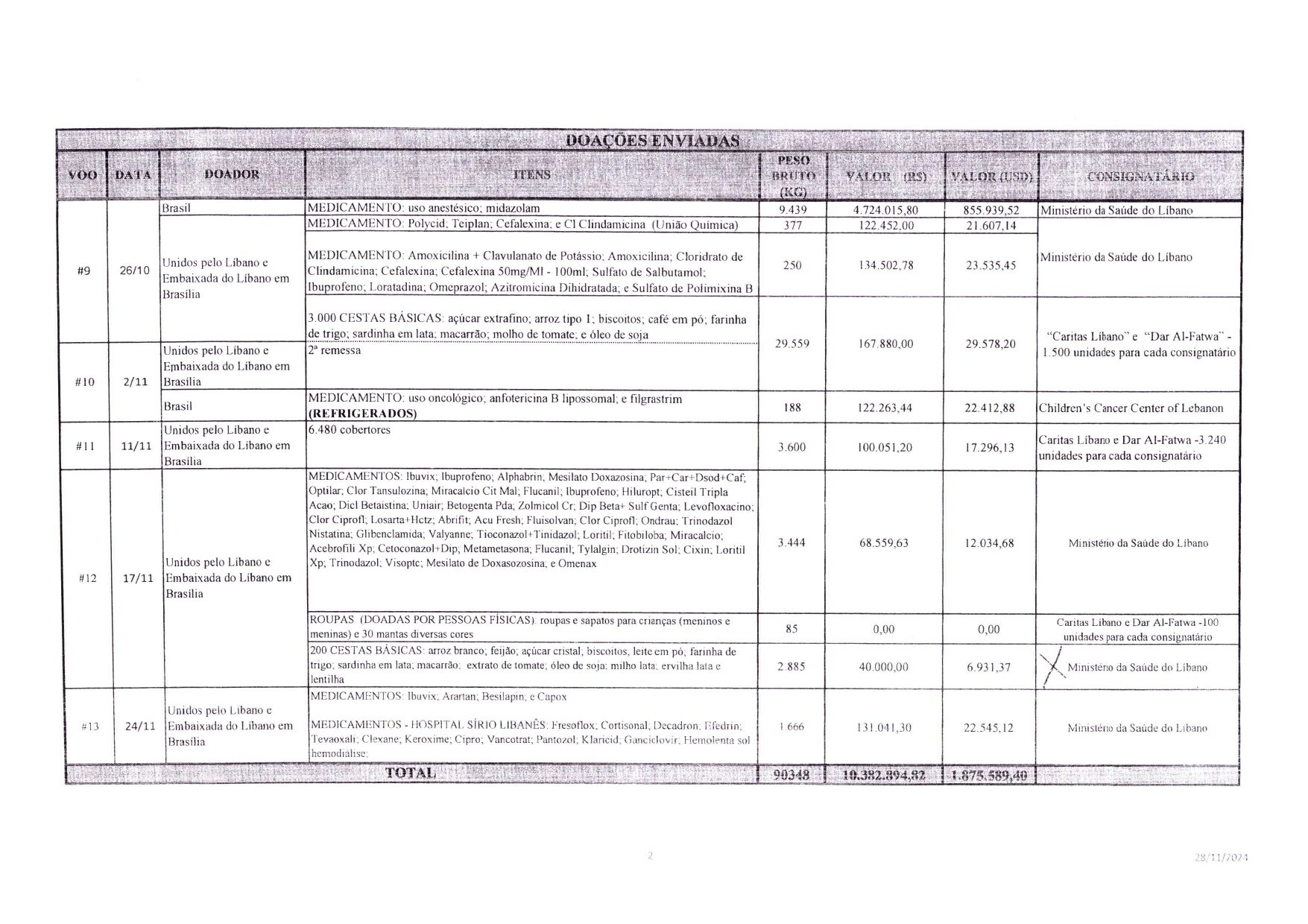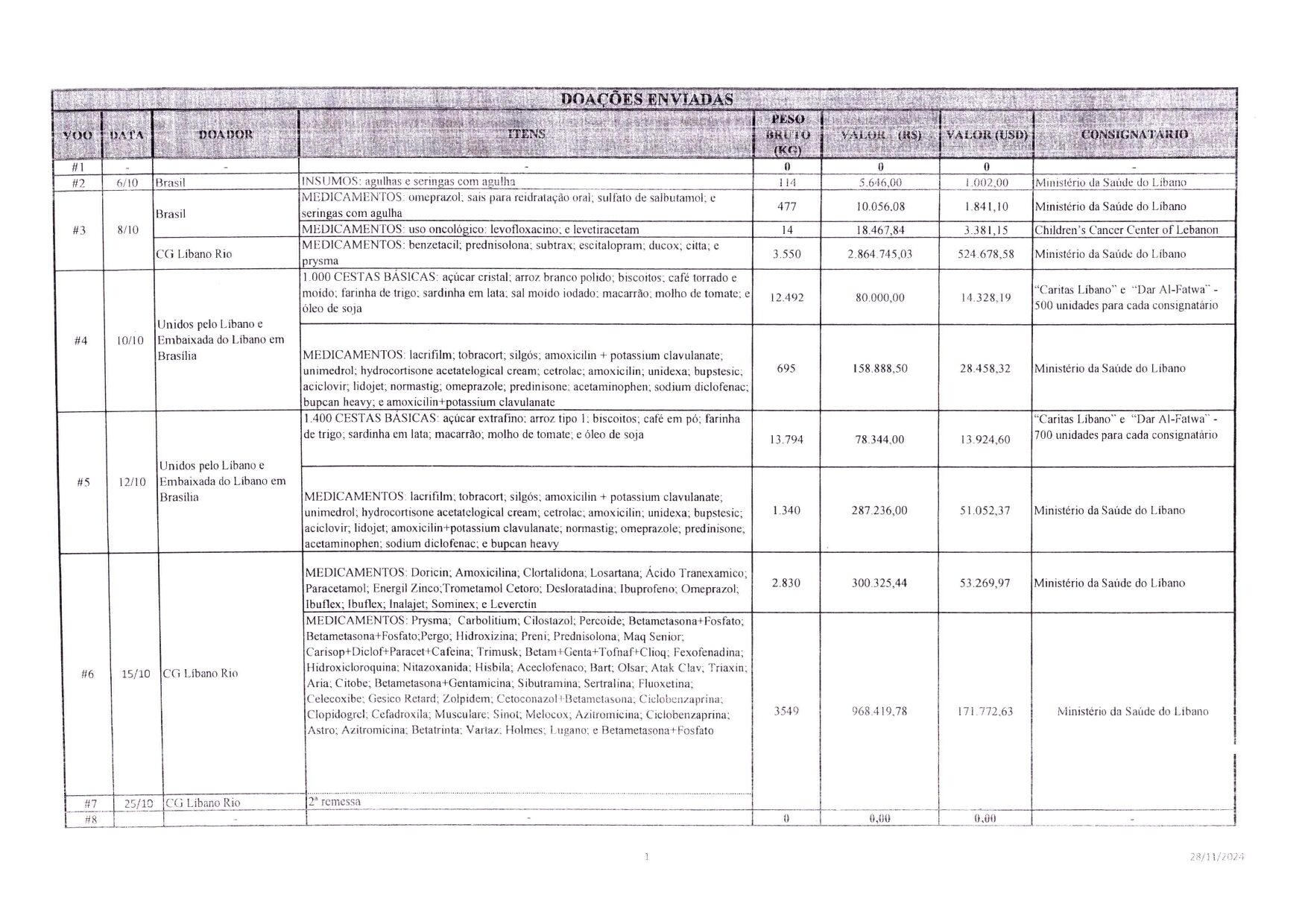 Anexa à correspondência, encontra-se a relação oficial emitida pelo Ministério das Relações Exteriores do Brasil (MRE), detalhando todas as contribuições enviadas ao Líbano. Esse gesto reafirma o compromisso e a amizade entre as nações, bem como a capacidade de mobilização e apoio da comunidade libano-brasileira nos momentos em que mais se faz necessário.