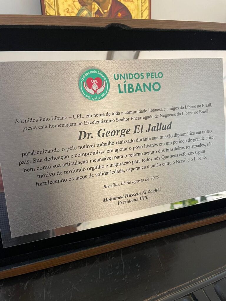 A organização Unidos Pelo Líbano participou do evento, representada pelo Dr. Frederico Aburachid, presidente da FULIBAN, e pelo Dr. Mohamed Charanek, Diretor Jurídico do Grupo FAMBRAS, ambos integrantes da UPL. Durante a cerimônia, prestaram uma homenagem ao Dr. George El Jallad em reconhecimento ao trabalho destacado realizado ao longo de sua missão diplomática.